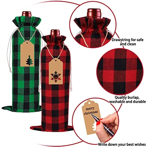 - 【Wide Applications】Christmas wine bottle covers are perfect for decorating wine bottles, classic Buffalo plaid design that never goes out of style, you can use them on important days like Christmas, New Years, birthdays, anniversaries, housewarmings, etc. They can make the festive atmosphere stronger and more festive! You can also use them as gift bags, fill them with candy or other gifts, and write down wishes on gift tags, your families and friends will love the gift like this.