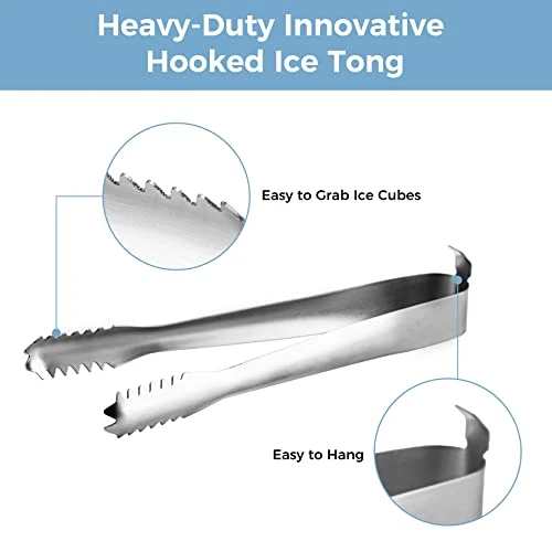 - User-friendly Innovative Design: Stainless steel tong for ice bucket features sharp teeth for extra grip; easily pick up ice cubes and carefully transfer to your drinks without messy slips and splatters. Innovative hooked ice tong securely hooks onto the wine bucket when not in use. Removable strainer sits stably in the bottom separating ice cubes from melted water. The knob handled lid makes it a breeze to open and put back in place.