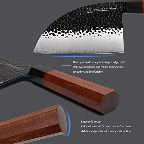 - 100% from Japan’s High Quality Steel – FAMCUTE series uses 9CR18MOV. With an HRC of 60+/-2 it will take an angled edge and hold it for long enough to help extend the life of your knife (w/ general maintenance). The clad dimple allow for easy food release while slicing or dicing. This blade is great for boning, cutting bone, preparing, filleting, skinning, trimming and butterflying all your favorite meats. Please refrain from cutting frozen products as this may detriment the knife’s edge.