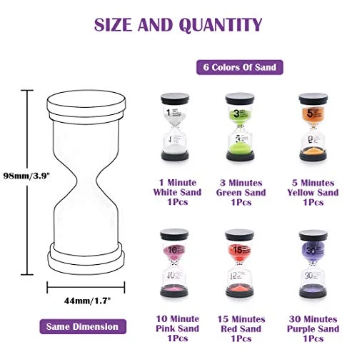 - 🌼 WIDE APPLICATIONS —– These colorful sand timers are not only beautiful, they can also be used in a variety of applications, such as Games, Classroom use, Cooking, Exercising,kids’ tooth brushing and so on, quiet reading or game sports timers. This is a Good gifts for children.