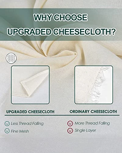 - 🧀🥛【HIGHEST QUALITY & LINT FREE】Only pure cotton is used with in our cheesecloth. That means you will never get recycled fibers or other impurities in the cloth, so you can use with complete confidence.