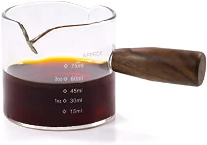 - DETAILED DESIGN: Our espresso shot glass measuring cup is designed with 2 spouts for easy pouring without turning. Graduated marks read in ounces and milliliters for all your measuring needs. The mouth of the pitcher is V-shape, wide enough to fit most kinds of portafilters