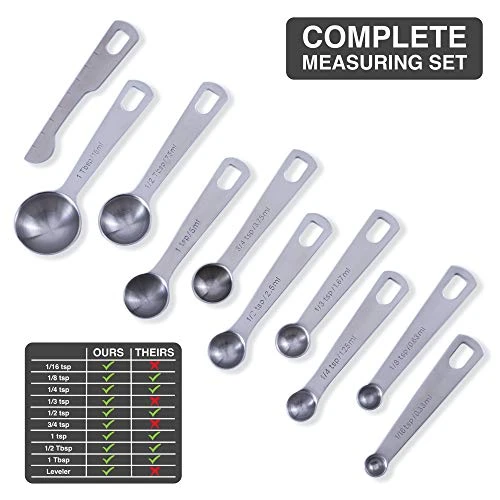 - Ultimate Precision – Each Spoon meets the ultimate precision of measure and is labeled in U.S.A. and Metric units for easy and quick measurements when needed. This set comes in 1 Tbsp(15ml), 1/2 Tbsp(7.5ml), 1 tsp(5ml), 3/4 tsp(3.75ml), 1/2 tsp (2.5ml), 1/3 tsp(1.67ml), 1/4 tsp (1.25ml), 1/8 tsp(.63ml), 1/16 tsp(.33ml) and Leveler.