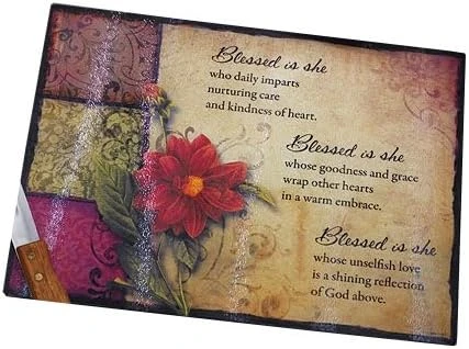 Unique cutting board is crafted of tempered glass and is heat safe up to 392. White box. Makes a lovely decorative piece when displayed on easel (sold separately). 15 5/8″ x 11 3/4.”