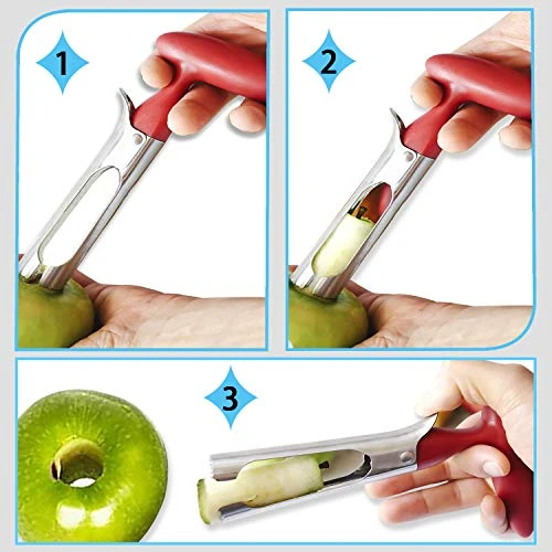 - Remove Core in Seconds: Serrated tip design, smoothly core through any apple, pear, bell pepper, cupcake, remove the core in seconds, simply pull out and open the core remover and pour out the core, very simple to core the fruits with it.
