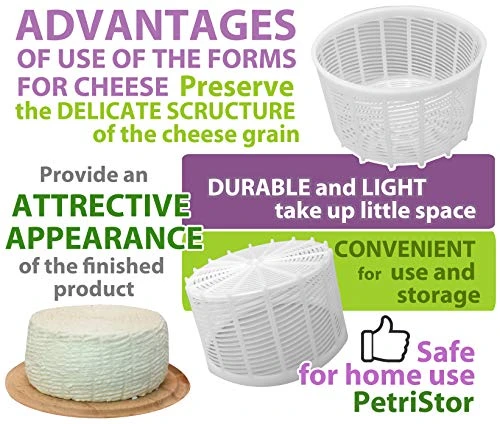 - Cheese molds for cheesemaking such hard and soft cheeses from cow, goat and sheep’s milk: Mozzarella, Maskrapone, Brie, Parmesan, Cambocola, Camembert, Gorgonzola, Tete de Mouans, Roquefort, Bocconcini, Burrata, Grana Padano, Castelmagno, Cachotte, , Ricotta, Talejo, Beaufort, Valenza, Gouda, Maasdam, Mildziter, Manchego, Radamer, Suluguni, Cachotte, Parmesan, Parmigiano, Dor blu, etc.