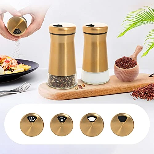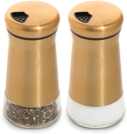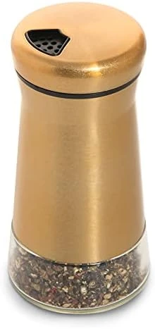 - STYLISH AND PERFECT DESIGN: The salt shaker is made of combined glass and copper-plated stainless steel, with a perfect golden luster. It is specially designed for modern homes. It is also a perfect choice for gifts. The exposed glass bottom lets you know what kind of spice is inside and when you need to refill it.