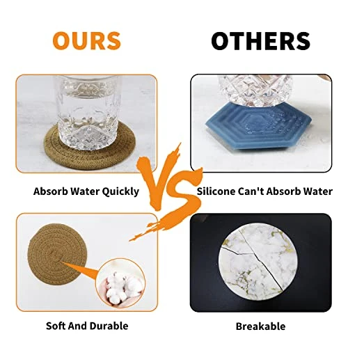 - SUPER ABSORBENT MATERIAL – These farmhouse coasters are made of absorbent cotton. Good water absorption keeps your cup bottom dry and protects your furniture. Easy fix for these pesky rings of moisture on your furniture. Enjoy a laugh and your favorite drink.