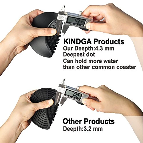 - PERFECT SIZE & DEEP TRAY: Kindga large drink coasters diameter 4.3 inches coasters can fit any large & small mug, cup or bottle. And the deep groove of 4.3 mm, an upgraded version compared to the common version on the market. The upgrade version flat cool rubber coasters for drinks can protect your desk well.