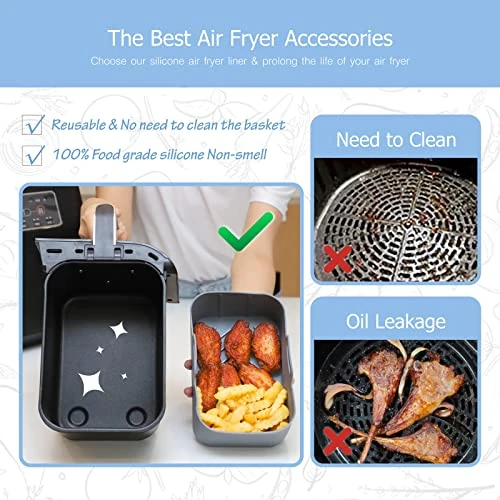 - ★ [ Premium material ] Made from 100% food-safe grade silicone. It is non-stick, non-toxic, non-BPA, and highly heat resistant, withstanding temperatures up to 428°F and down to -40°F.Air fryer parchment paper liners 100% food grade wood pulp, no fluoresce, non-toxic, odor-free.