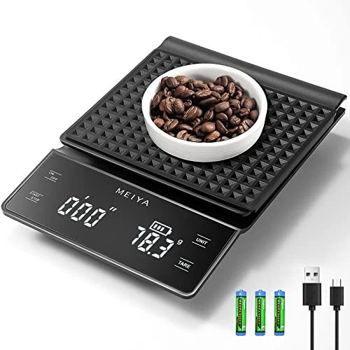 - ✔② CONSISTENTLY ACCURATE: The digital scale adopts American design pressure-bearing high precision sensor, weighing range is 0.5g-3000g with 0.1g increments. with oz/g/ml 3 units can weigh solids, liquids, powders, etc., helping you to accurately measure your many coffee recipes and most occasions such as baking, cooking, coffee, milk powder, meal preparation, soap and candle making, etc.
