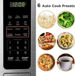 - Large LED digital display, easy-to-read control panel, child safety lock, interior lights, and removable 12.4-inch glass turntable