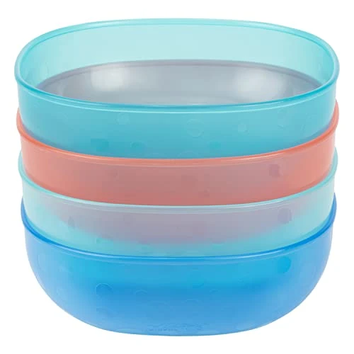- Bright colors keep baby’s attention! Easy to clean and stacks for simple storage. Dishwasher (top rack) and microwave safe. BPA free. 4m+.