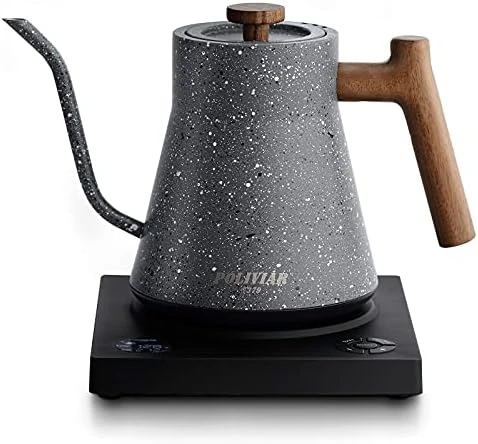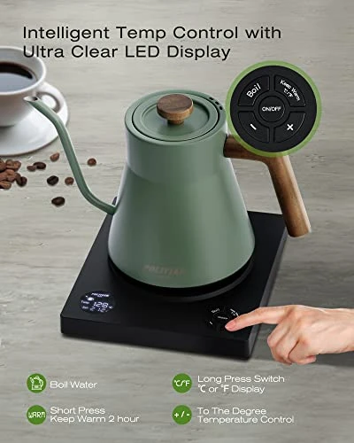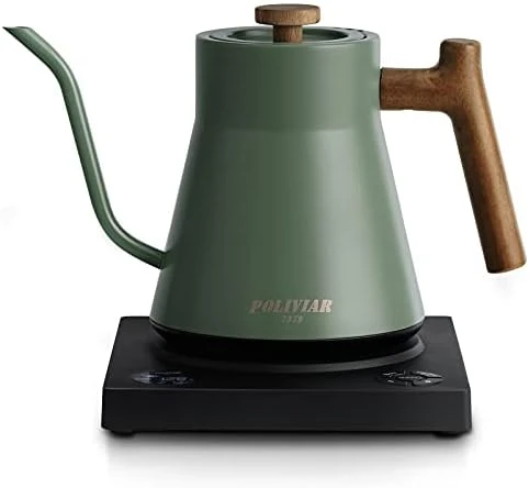 - LIGHT UP YOUR DECOR WITH NATURE WOOD DESIGN: 34oz tea kettle will brighten your home, office and kitchen. Gooseneck electric kettle BPA free real wood handle allows you to grab the gooseneck kettle with bare hand without risking burns. Water kettle electric ergonomic shape and design maximaze your comfort to lift, pour and fill. Electric kettle temperature control. It is highly recommanded to use a set of POLIVIAR coffee press(ASIN:B0834RLLSR).