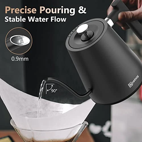 - 【1200W Fast Heating】The high power of 1200W makes the gooseneck kettle heat up quickly, and it only takes 3 to 5 minutes to boil a pot of 0.8L water. Greatly reduces the waiting time for brewing coffee or tea. After heating, you can set a desired temperature and press the keep warm button to keep warm. So you can get warm water to brew coffee or tea at any time.