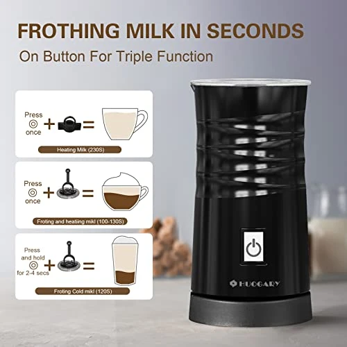 - 【ONE BUTTON SIMPLE AND QUICK OPERATION】: Just press the button in the middle of the milk steamer and frother to make exquisite milk froth within 2 minutes, allowing you to make perfect latte, coffee, hot chocolate, milk froth, etc. (1. Hot froth : The milk frother keeps still, press the button and it will display red to indicate hot frothing; 2. Cold frother: keep the milk frother in a static state, long press this button for 2-4 seconds, the button shows blue to indicate cold frothing.