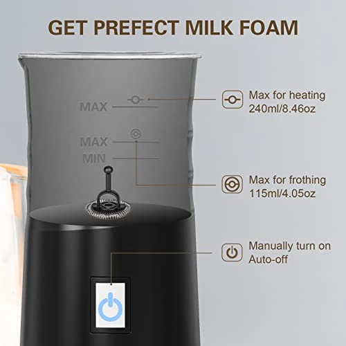 - 【THREE FUNCTION OPTIONS】: According to your different needs, this electric milk frother can produce milk froth with three different textures, the maximum frothing capacity is 4.05oz / 115ml, the minimum frothing capacity is 2.64oz/75ml, and the maximum heating The capacity is 8.46oz / 240ml milk (recommended whole milk (fat) content> 3%)) for better results)