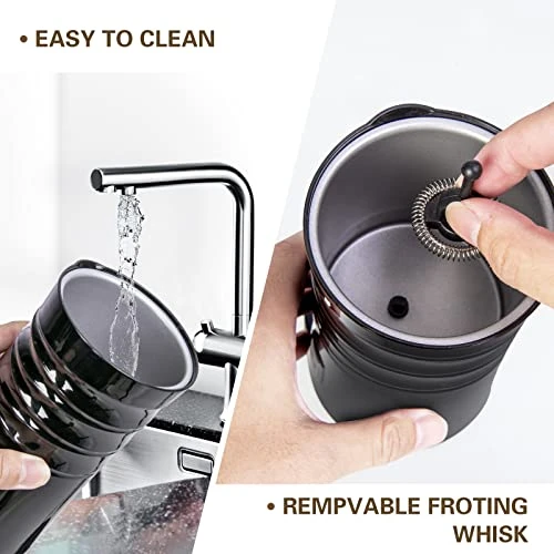 - 【EASY TO CLEAN】: There is a non-stick coating inside the milk foamer. Clean the inside with soapy water and a soft brush after use. (Note: Do not rinse the outside of the milk frother directly with water, just wipe it with a cloth. Do not put it in the dishwasher for cleaning.)