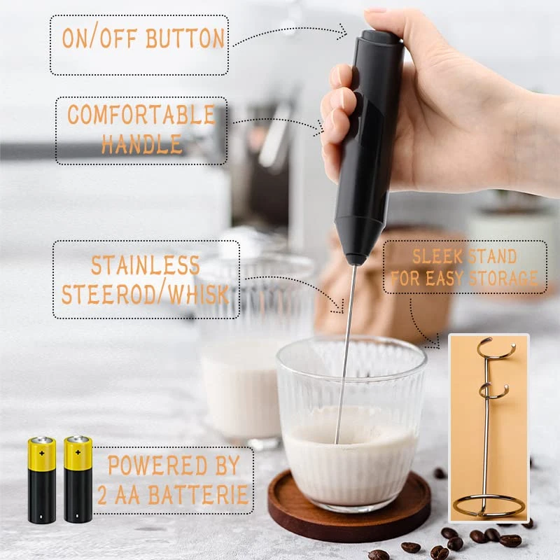 - EASY TO USE AND CLEAN – The power button at the top of the frother for coffee makes it easy to use. Cleanup for this mixer electric handheld is easy and fast. It is easy to clean by sticking the whisk end into a stream of running water or soapy water and giving it a short spin, then drying by pushing the button again for 2-3 seconds. Milk frother electric is powered by two AA batteries (not included).