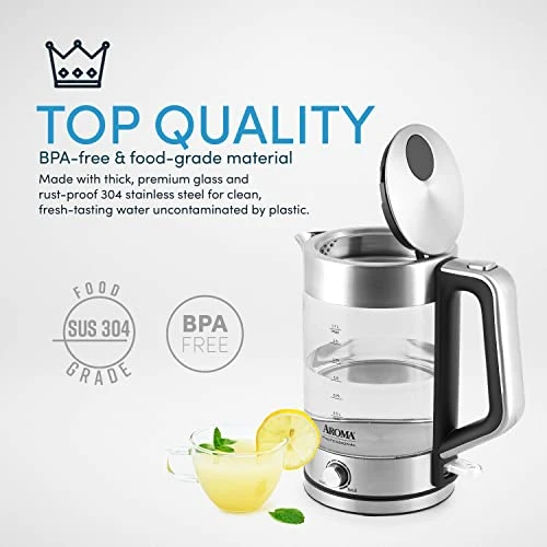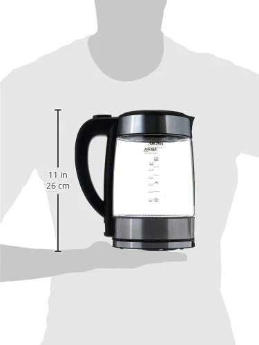 - MODERN AESTHETIC: Soft blue LED lights illuminate the thick glass kettle when heat is turned on. Plus, the large handle is trimmed with matching stainless steel for added shine.