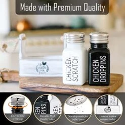 - Farmhouse Decor: Modern salt and pepper shaker set makes a great addition to any dining table or kitchen counter. Perfect for white kitchen decor “chicken scratch” and “chicken droppins” phrases on the side for a cute touch 😉 These are beautiful chicken salt and pepper shakers. Great modern farmhouse decor!
