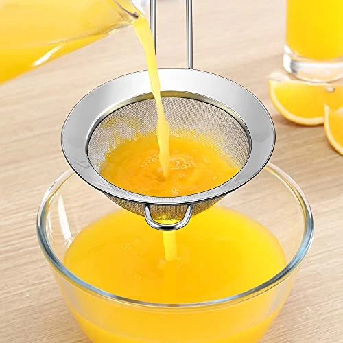 - 0.71 MM ULTRAFINE MESH WITH LONG HANDLE: Stainless steel sifter features concave fine mesh design, 0.71 mm ultrafine mesh hole contribute to filter small particles efficiently and quickly, Smooth long handle with no burrs for comfortable grip, The seamless steel rim prevents food from getting trapped between the mesh and the rim, And the hanging loop is designed for the strainer to rest easily and steadily in your cookware or bowls