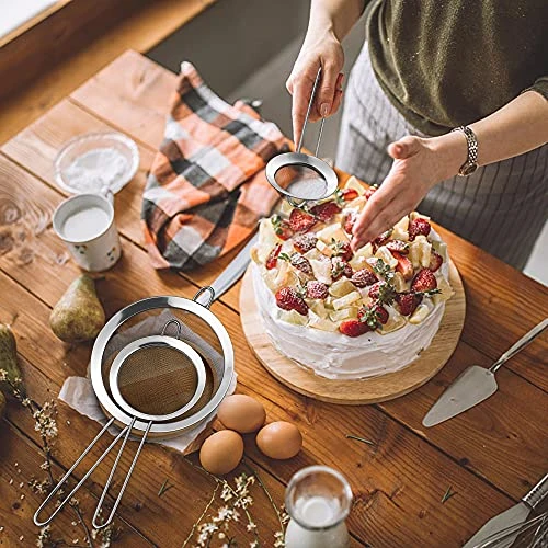 - EFFICIENT SIFTING, STRAINING & RINSING: Large sifter perfect for sifting out impurities and breaking up clumps in dry ingredients like flour, sugar, spices, quinoa, Rinsing fruit or vegetable or rice, Medium sifter perfect for straining thick or thin wet ingredients like sauces, lumpy gravy and yogurt, Small sifter for sieving cocktail, tea or the sludge of coffee ground left