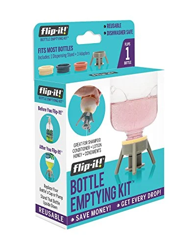Flip-It! BOTTLE EMPTYING KIT — Get Every Drop! STAND THAT BOTTLE UPSIDE DOWN. Simply replace your bottle’s original cap OR pump with the patented Flip-It! Then open the valve to squeeze out every drop. GREAT FOR ANY THICK LIQUID — including shampoo, conditioner, lotion, gels, and lots more. WASHABLE and REUSABLE. Use Flip-It! in the Bathroom, Kitchen, Laundry Room, Garage, Workshop, Office and Beyond. You can also use Flip-It! to transfer product from one bottle to another, including refills and travel-size bottles. This Combo Pack contains 4 Grey Base Cap/Stands, plus 4 Large 33mm Coral Adapters, 4 Medium Grey Adapters and 4 Small Sand Adapters to fit most screw-top bottles worldwide. (Sand Adapters enable Flip-It! Base Cap/Stands to fit most smaller bottles like face cleanser, face lotion, abrasive cleaners, liquid car wax, leather conditioner, hand sanitizer and more.) Flip-It! features a simple push/pull valve for dispensing product, and bottles will only stand upright when the valve is closed so your products won’t leak out. BPA-free, food-safe and dishwasher-safe. Designed for use with screw-top squeezable bottles; not for use with glass bottles. Reduce waste and frustration — SAVE TIME & MONEY! Flip-It! … Because Every Ounce Counts!