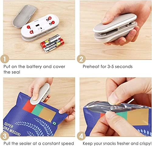 - ●Easy to use: Instructions for use are included. See also the video. Load 2 x 5 batteries and press the sealer for about 3-5 seconds to start heating. Place the bag to be sealed in the middle and pull slowly at a constant speed. The sealer can be repeated for best results.