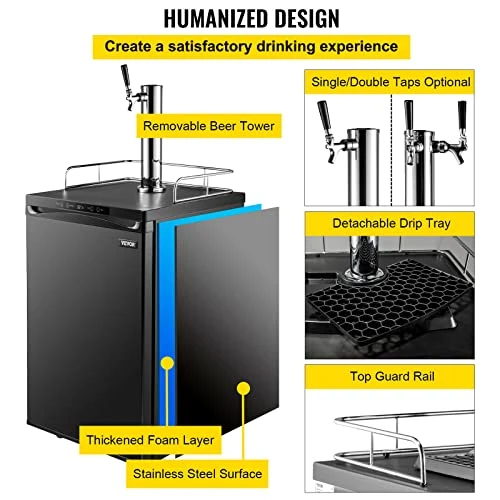 - Considerate Details: Equipped with 4 omnidirectional casters, our beer dispenser is easy to transport. Meanwhile, 2 lockable front casters ensure the stability of the dispenser. Featuring a removable non-slip drip tray and an easy-to-install chrome rail, our beer dispenser provides you with an excellent drinking experience. Besides the included 304 stainless-steel beer tower, our refrigerator is also suitable for all beer towers sold by our brand.