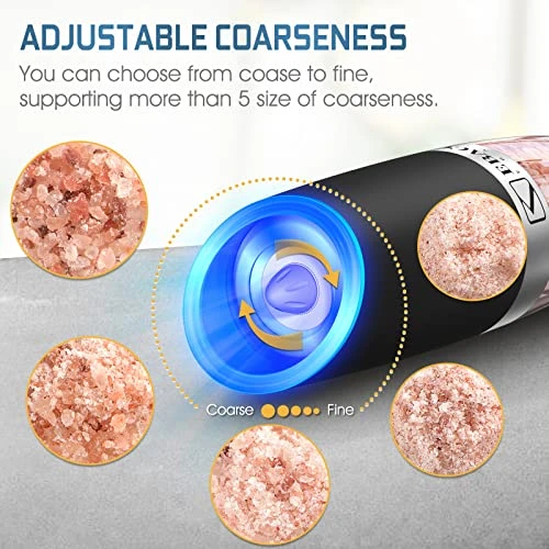 - ✅✅ ADJUSTABLE COARSENESS- Automatic salt and pepper grinder with adjustable grinder rotor, you can easily adjust the grinder knob to choose the coarseness of your spice, salt, or peppercorn.