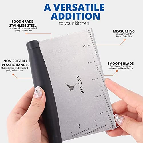 - ⚖️⚖️𝐌𝐞𝐚𝐬𝐮𝐫𝐢𝐧𝐠 𝐆𝐮𝐢𝐝𝐞 – Our flat top griddle scraper comes with a helpful measure guide and inch marking scale to help you perform your cooking with precision and accuracy. With the Rivexy stainless steel dough cutter, you can bring consistency and precision into your indoor and outdoor cooking.