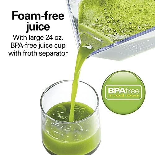 - FOAM-FREE JUICE WITH 24 OZ. JUICE CUP: The 24 oz. BPA-free juice cup with froth separator that comes with the juice extractor keeps juice neatly contained and strains off the froth when pouring juice.