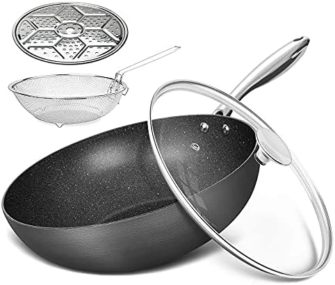 - For Your Various Needs- The nonstick woks and stir fry pans set is everything you need and can be used as deep frying pan, saute pan, deep skillet, frying wok, stir fry wok, stir fry pan, baking dish, roasting pan, rice cooker, steamer and deep stockpot.