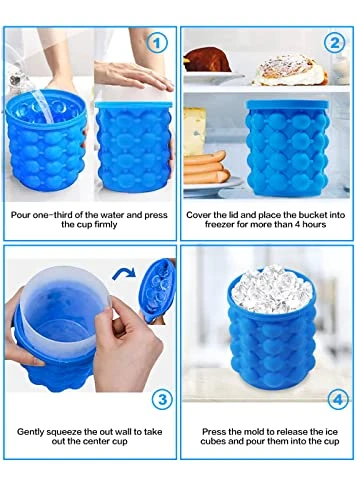 - 🧊Usage Method 2: First, fill the inner bucket to one-third, then press hard on the inner bucket. (The edge of the inner bucket should be lower than the edge of the outer bucket) Place the ice bucket horizontally in the freezer for 4 hours or more. Take out the ice bucket and squeeze it hard to make the ice fall.