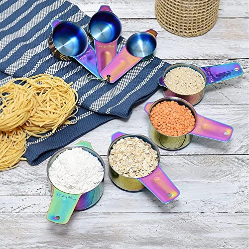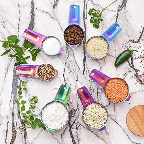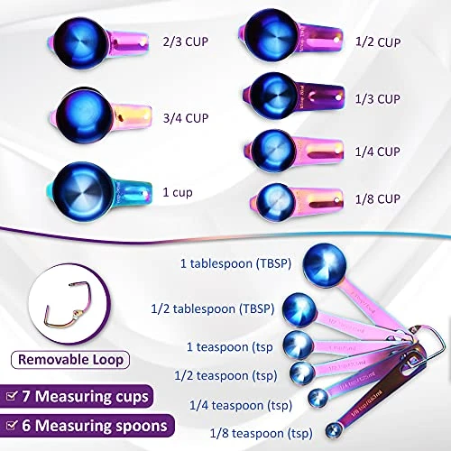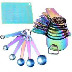 - SAFE; Each rainbow iridescent measuring cups and spoons set has undergone stringent quality inspection and many hours of development; This set of thirteen metal measuring spoons and cups are rust resistant, non toxic and suitable for dry and wet ingredients; The KichBits promise is this; if we wouldn’t use the measuring cup set ourselves, we won’t sell it