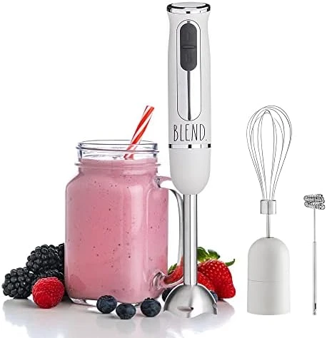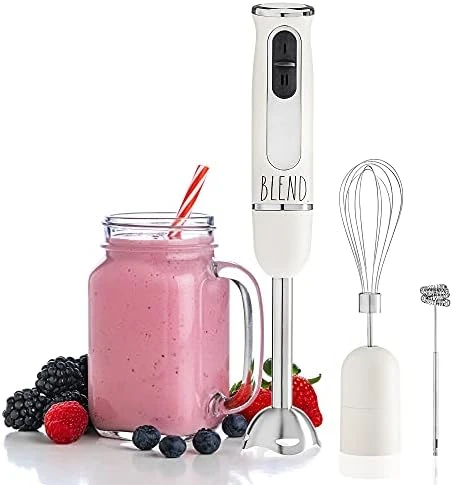 - Key Features: The handheld immersion mixer has a two speed operation, as well as a power cord for easy use. It comes with an egg whisk and milk frother attachment. The blender comes in a sleek cream color.