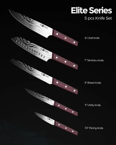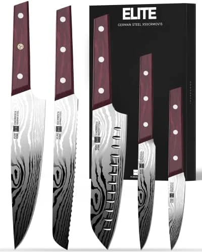 - 【Innovative Design Knives】The Elite series of 5 pieces knives set is distinguished by a gorgeous damascus patterned x50crmov15 German steel blade (not damascus steel), Classical red-colored Pakkawood handles that evoke the artistry of kitchen knives. Full tang and durability that are comfortable, well-balanced, easy to use.