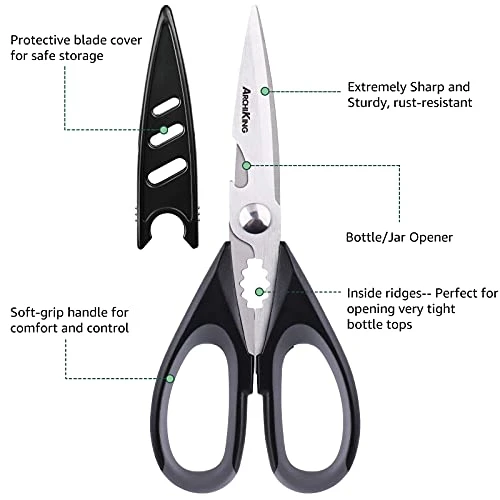 - Built-in Bottle Opener: The meat scissors has micro-serrated blade edges which provide non-slip cutting for various kitchen tasks. The serrated section in easy-grip handle for opening tough sealed bottles or and cracking nuts! Plus bottle opener in the blade for fast & easy opening of bottles and jars. Easy to hold and Use. Comfortable easy grip for both right and left handed chefs, these super sharp scissors will make food preparation easier and faster.