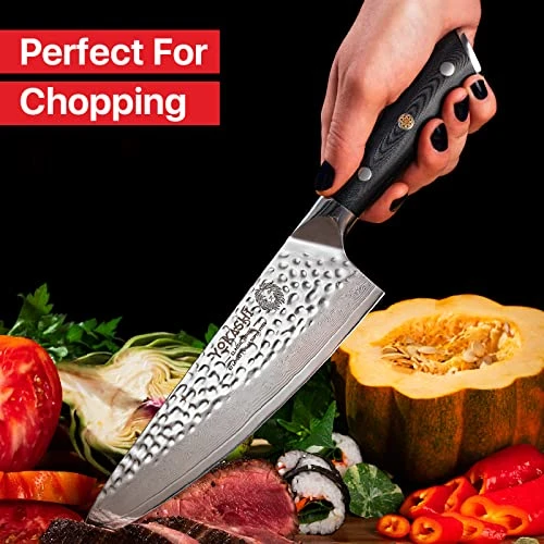 - Comfortable & Durable – This 8 inch Japanese chef knife features an ergonomic handle for a secure grip when slicing & chopping. With its full-tang design & G-10 handle, it’s built to withstand heat, cold, and moisture, ensuring longevity & durability