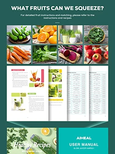 - 🍇【What can be squeezed with a cold press juicer】Compared with manual juicers, aiheal juicer uses one-key start to extract soft and hard fruits and vegetables. Soft fruits such as tomato, watermelon, orange, grape, cucumber, etc. Hard vegetables such as celery, wheatgrass, apple, pear, carrot, etc. The detailed table is in our manual, also comes with a recipes containing a variety of juice. Very suitable for weight loss people, children, the elder.