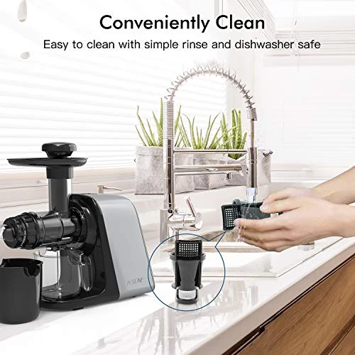 - Easy to Clean & Operate – One-step installation design allows you to assemble the juicer machine in seconds. Specific markings help you assemble and disassemble efficiently. The upgraded filtration system allows you to rinse quickly and easily. Also, reverse button can avoid jamming and help clean. Parts are dishwasher safe for easy sanitation. Besides, the button Beep-Sound Reminder, Anti-drip Cap, Hidden Handle….These user-friendly designs will enhance your user experience.