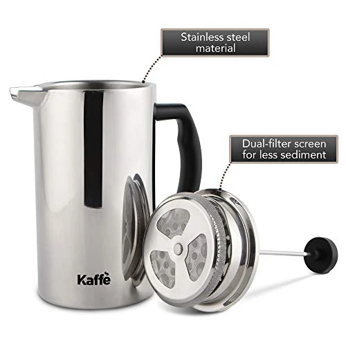 - ⚙️ BALANCE BETWEEN CAPACITY, LONG LASTING USAGE AND SAFETY. Kaffe large french press has a 6-Cup Capacity (800 ml / 27 oz). An additional filter included with our french press coffee ensures long lasting and durable usage with no rust. At the same time, it maintains the pure taste of coffee with the best aromas without any additional VS cheap analoges.