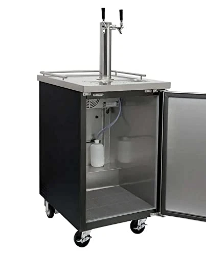This heavy-duty kegerator comes with everything you need to dispense two home brew ball lock kegs, including the kegs themselves! All you need to do is brew some beer, kombucha, wine or soda, or take the kegs to your local brew pub to have them filled! The dispense system includes a polished stainless steel double faucet draft tower, two sets of ball lock keg couplers, a Premium Dual Gauge Two Product Regulator, a glossy red 5 lb. aluminum CO2 tank and all the fittings necessary to tie everything together! The black HBK1XB-2K kegerator cabinet features 4″ locking casters for mobility, steel walls with a shock reducing rubber floor mat, a stainless steel top with a built-in drip tray, fan forced cooling with a blower that directs cool air into the tower and a knockout that allows you to mount the CO2 tank outside the unit. A 1/7 hp compressor and foamed in place polyurethane insulation cool your keg and keep it cold until the last drop. PLEASE NOTE: This is a homebrew kegerator and includes ball lock keg couplers for home brew kegs; it will not tap commercial D system kegs.