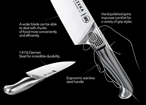 - [Innovative Design] Beautifully designed, ergonomic,and light weight handle is balanced and pleasant in your hand. The innovative curved and wider bolster promotes proper handling for precise control and safety. Working with this kitchen knife set is such a fabulous experience!