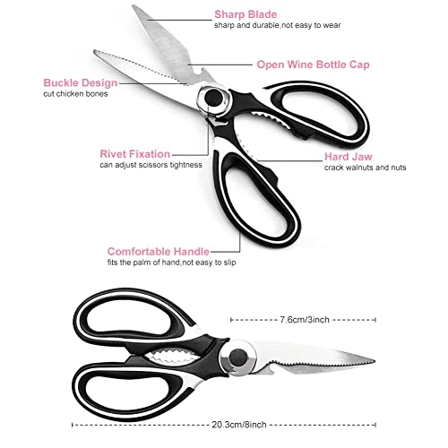 - 【Multifunctional Scissors】Our scissors can cut chicken bones,scrape fish scales,cut shrimp and vegetables.It can open a beer bottle.It can also open walnuts.You can also use it to cut cardboard,twine and food packaging.
