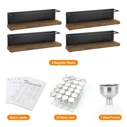 - 【EASY ASSEMBLE】The magnetic rack is already assembled, making it easy to set up in your kitchen. The included steel funnel makes it easy to fill up the spice jars without making a mess on your countertop.