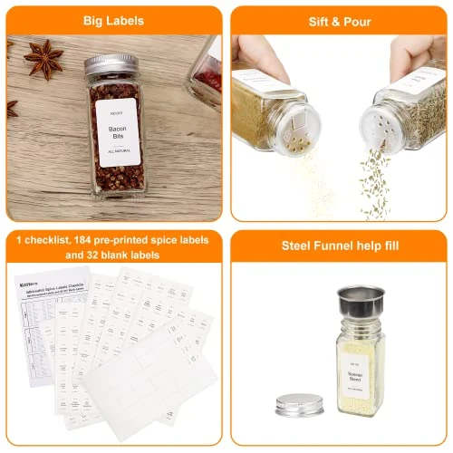 - 【24 GLASS JARS & LABELS】Each of the 24 lead-free glass jars can hold 4oz of spices. The 2-in-1 shaker lid features both sift and pour tops, making it easy to use for light seasoning. The product also includes 184 pre-printed spice labels and 32 blank labels for DIY, making it easy to find the spice you need while cooking.