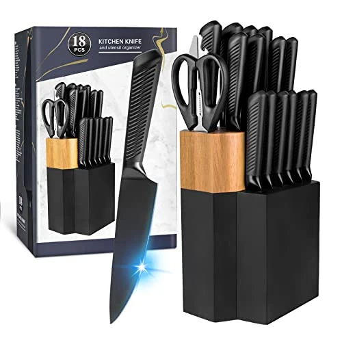 - 【Easy to Store and Clean】-All Knives store safely in the wood knife block, ensure the long-term durability and corrosion resistance of the tool. The knife set with wooden block has non-slip rubber feet. Due to the weight of the block and the rubber feet of the floor, it is almost impossible to tilt or move it on the workbench. Wash them by hand and dry them by soft cloth immediately after each use will help to keep sharp and extend the service life.