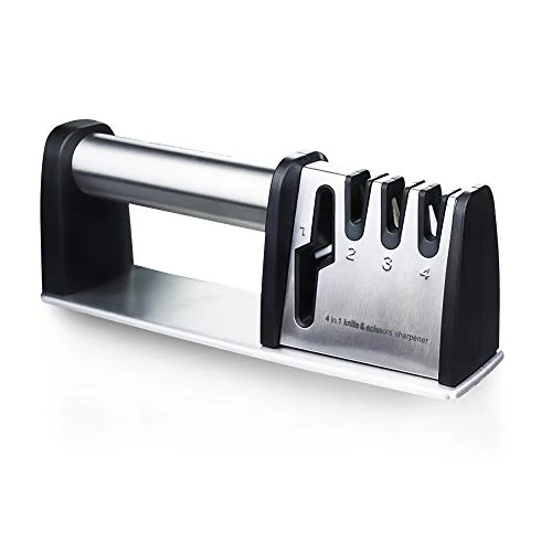 Upgraded kitchen knife sharpener efficiently restores and keeps straight blades in top sharpened state quickly and easily. This does a fantastic job of sharpening both knives and scissors. Very handy kitchen device. Sharp knives make such a difference.